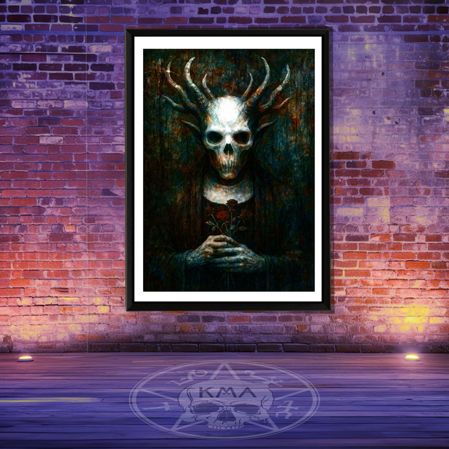 A haunting, painterly vision rendered with rich texture and depth, this artwork depicts a skeletal figure crowned with branching antlers, gently clasping a small bouquet of dark roses. The contrast between death and tenderness creates a powerful, emotive presence—both unsettling and serene. Deep, weathered tones of teal, umber, and shadow give the piece an aged, almost mythic quality, while the silk finish enhances detail without glare, lending the image a soft, gallery-grade elegance.